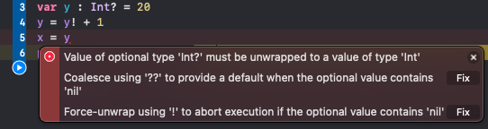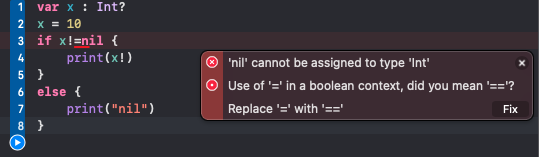 "x!=nil"처럼 붙여서 써버리면 forced unwrapping인 줄 알기 때문에 띄어쓰기를 해줘야함.
