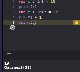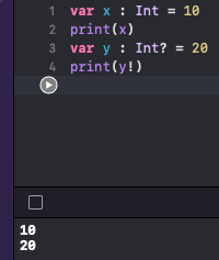 "!"(느낌표)를 사용하면 Optional 변수를 사용할 수 있다.