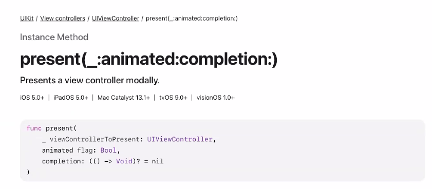 present() 메서드는 iOS의 UIKit 프레임워크에서 제공하는 메서드로, 현재의 뷰 컨트롤러에서 다른 뷰 컨트롤러를 모달 방식으로 표시하는 데 사용됨.(시험에 자주 나옴.)