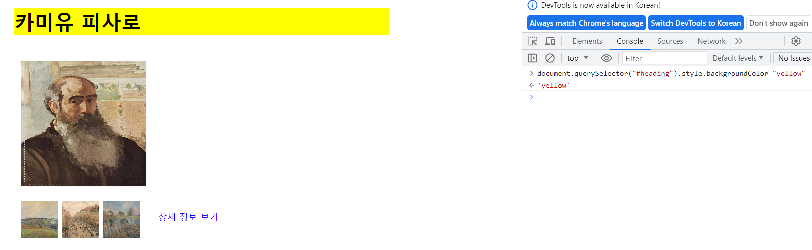 id 선택자를 사용하여 heading에 접근해서 "카미유 피사로"를 누르면(onclick) 색이 변하는 함수가 작동하도록 해보겠습니다.