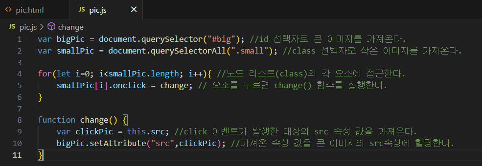 smallPic[i].onclick = change; // 요소를 누르면 change() 함수를 실행한다.