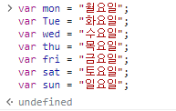 - 배열 이름과 대괄호([ ]) 안에 인덱스 숫자를 넣으면 해당 위치의 값만 가져온다 ex) week[0] --> "월"